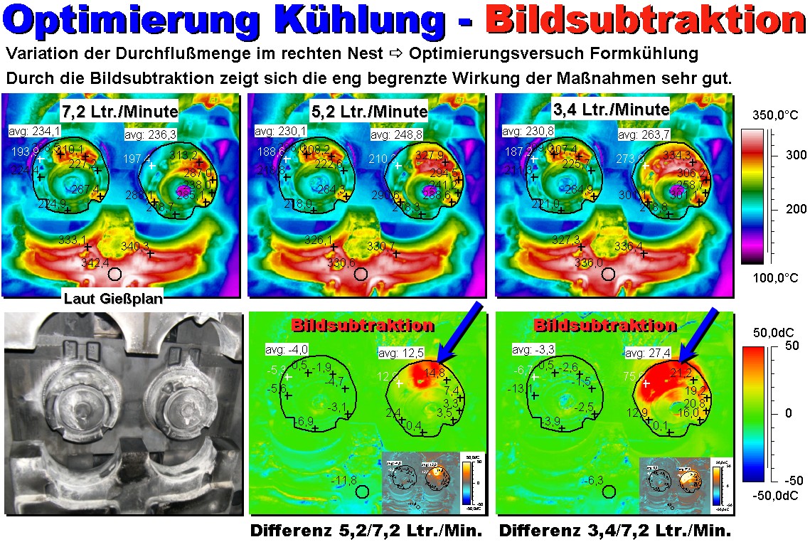 Foto links: Typische Oberfläche einer Druckgußform, die zur Demonstration halbseitig schwarz lackiert ist. Auf der blanken Seite schwankt die Emissivität (ε) von 0,18…0,98 ! wodurch die im IR-Bild links gezeigte Temperatur ohne Korrektur fernab der Realität liegt. Ein Mittelwert für ε hilft nicht, da extreme Sprünge binnen weniger mm auftreten (siehe Kavität). Durch einmalige Schwärzung nahe der Prozeßtemperatur nach längerem Stillstand entsteht homogene Emissivität um 0,97. Jetzt zeigt sich die reale Temperatur. Aus dem Vergleich blank/schwarz wird mit der IR-Control Software der Automation Technology GmbH in Trittau die „Emissionskarte“ generiert. Die Temperatur soll sich während der Beschichtung möglichst nicht ändern (quasistationären Zustand abwarten). Im lfd. Betrieb brennt die Farbe, bzw. andere geeignete Materialien binnen 3...5 Schuß ab. Dann wird die Emissionskarte zugewiesen. Ergebnis: Anzeige der realen Temperaturen im Livebild ! (Fehler ≤ +/- 15 K, außer Reflexionen, die sich örtlich oder thermisch ändern). Das zum Patent angemeldete Verfahren wurde mehrfach erfolgreich erprobt, soll aber vor dem Industrieeinsatz noch weiter optimiert werden (Ziel: Schwärzung ggf. nicht zwingend im stat. Zustand erforderlich). Deshalb dies als Ausblick auf künftige Möglichkeiten der Thermografie im Druckguß.